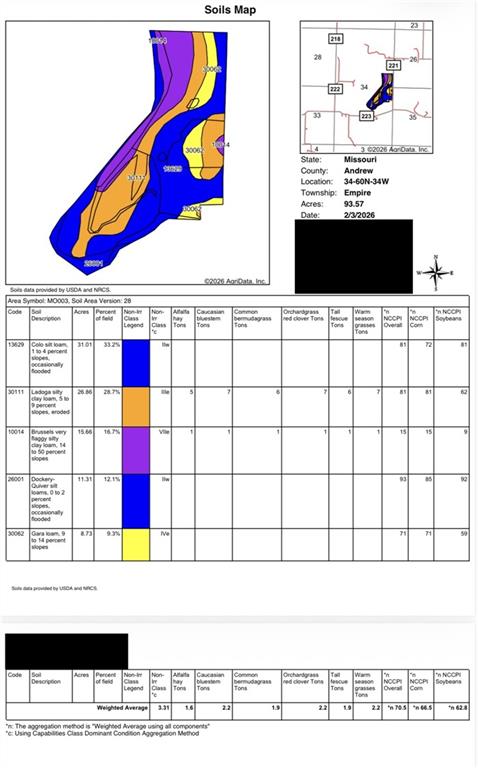 Andrew County Combination Farm--95 Acres on the Platte River. Discover this versatile 95-acre mol farm in Andrew County with direct frontage on the Platte River. This property includes 25.5 mol acres of high-quality bottom ground consisting of Class II soils and an overall NCCPI rating of 93 and 81, plus 10 acres mol currently in hay that could be converted to row crop. The remaining 41 acres mol consists of pasture that is fenced and crossed fenced and includes a pond, plus two spring-fed streams that run year around. Located just 9 miles from Savannah, this farm offers a perfect combination of quality, productive cropland, hay ground, and pasture. Schedule you private tour today.