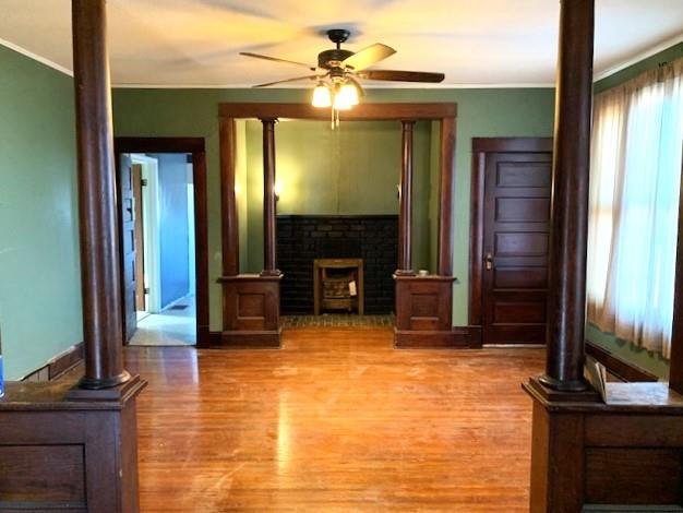 Super location and filled with period charm!! Most of the original trim remains in the home; tall baseboards, wide door casings, columns, fireplace and hardwood floors. The yard in HUGE and has plenty of space to add a detached garage. The bathroom has been updated within the last 8 years. Laundry hookups were added in the bathroom or you can use the originals in the basement. The second floor is a blank canvas. The seller had planned to make it a primary suite and has the plumbing started for a bathroom. Several of the windows were replaced with vinyl double paned windows. The home is being sold "as is" but inspections are encouraged for your piece of mind. Room sizes, sq ft and taxes to be verified by buyer/buyer's agent. Information deemed reliable but not guaranteed.
