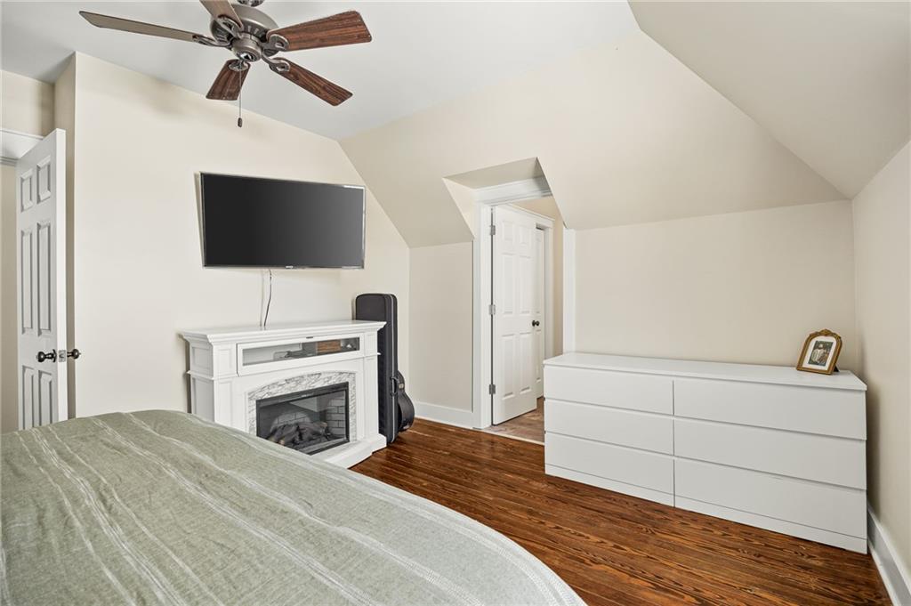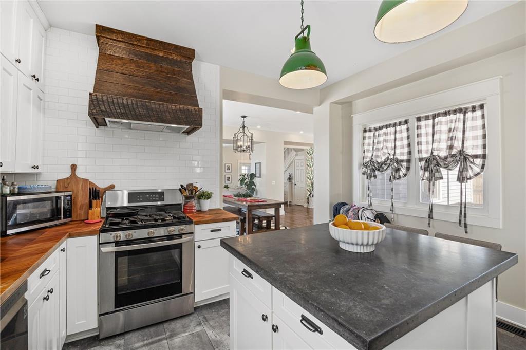 Charming 3-bedroom, 3-bath home featuring wood floors throughout and a beautifully designed kitchen with an island topped with a concrete center, butcher block counters, a farmhouse sink, and a handmade wood range hood. The main level offers a full bath and convenient laundry, plus a cozy living room with a ventless gas stove. Upstairs, all three bedrooms feature gigantic closets, including a spacious primary suite with a walk-in closet and an en-suite bath with a walk-in shower, along with two additional full baths. Outside, enjoy a 2-car detached garage and ample off-street parking.