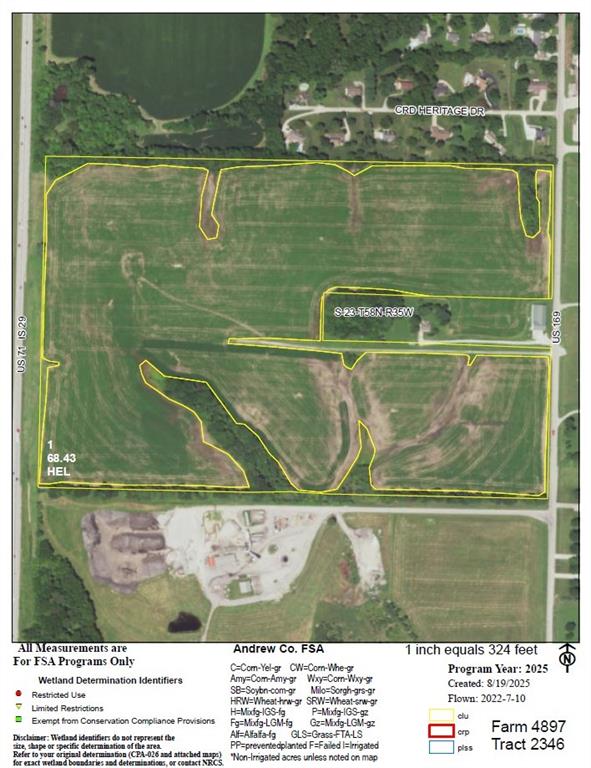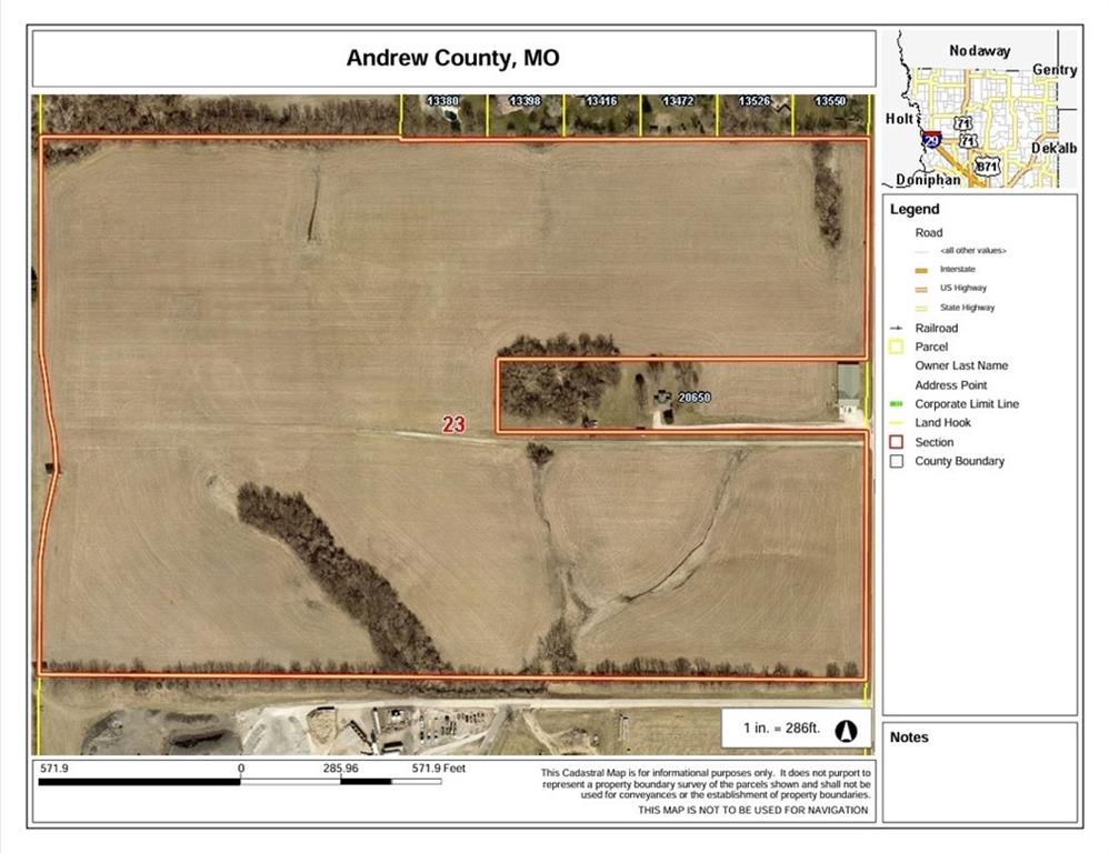 Located along N 169 Hwy in St. Joseph, MO, this 77+/- acre parcel presents a prime opportunity for investors and developers alike. The land is highly tillable, making it an exceptional choice for agriculture endeavors, while its strategic location offers potential for future development. With expansive open spaces and fertile soil, it is ideal for both farming and investment purposes. This property not only promises productive farmland but also holds significant value as a potential build site for residential or commercial projects. There are also 2 large billboards on the West boundary for I-29 traffic paying a total of $6000 annually. Billboard contracts expire in 2026 and can be renegotiated then. Its proximity to major transportation routes enhances accessibility, further increasing its appeal as a versatile investment opportunity.
