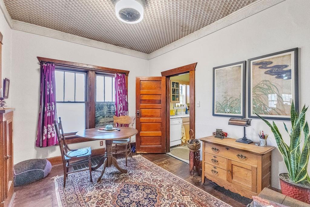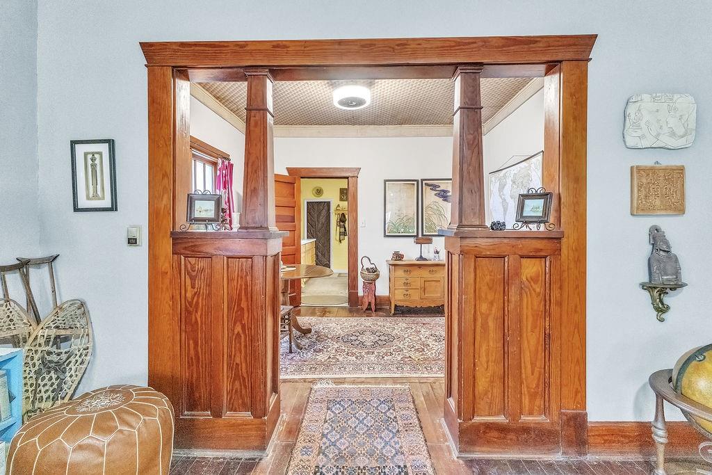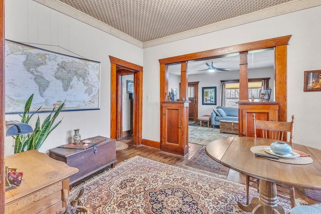 Charming and full of character, this 2-bedroom, 1-bath bungalow offers timeless appeal with thoughtful details throughout. Nestled beneath mature shade trees, the inviting front porch creates the perfect space to relax and unwind, complete with room for seating and outdoor enjoyment. Inside, you’ll find beautiful original woodwork, built-ins, and warm architectural accents that give the home a rich sense of history and craftsmanship. The spacious living area flows seamlessly into a formal dining space framed by classic columns, creating an open yet defined layout ideal for everyday living. Natural light fills the home, highlighting the unique textures and finishes. Upstairs, a large unfinished attic provides excellent storage or potential for future expansion. Outside, the property features beautiful crabapple trees, a generous yard with plenty of space for gardening, pets, or outdoor gatherings. With its blend of charm, character, and opportunity, this bungalow is a rare find ready to welcome its next owner.