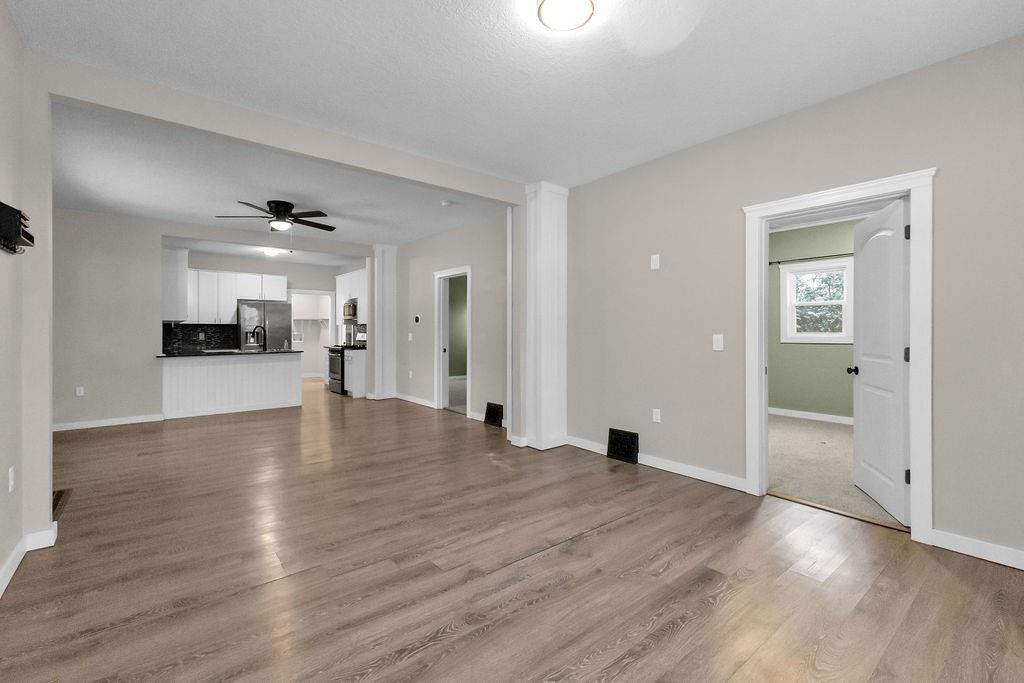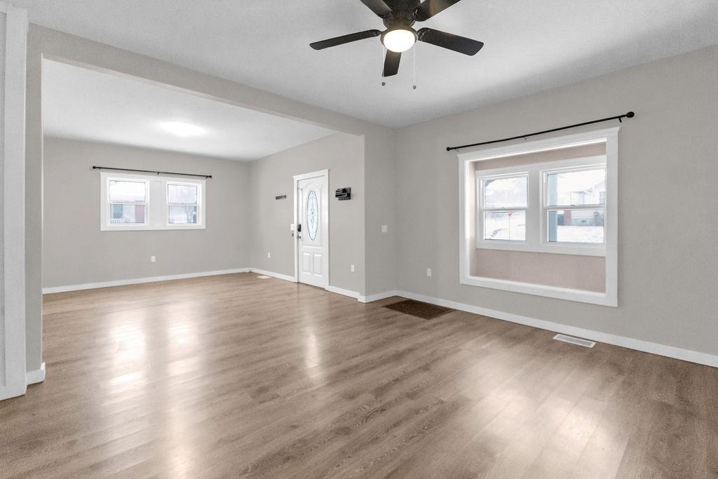 This beautifully updated home offers a bright, open layout with a large living and dining area that flows seamlessly into the kitchen. The kitchen features white cabinetry, stainless steel appliances, tile backsplash, and plenty of counter space for cooking and entertaining. Two comfortable bedrooms sit just down the hall, along with a spacious full bath that has been stylishly refreshed. Main floor laundry adds convenience, while the detached 1-car garage provides secure parking or storage. Outside, enjoy a generous yard and charming curb appeal, complete with a welcoming front deck. A clean, move-in-ready home with modern touches throughout.