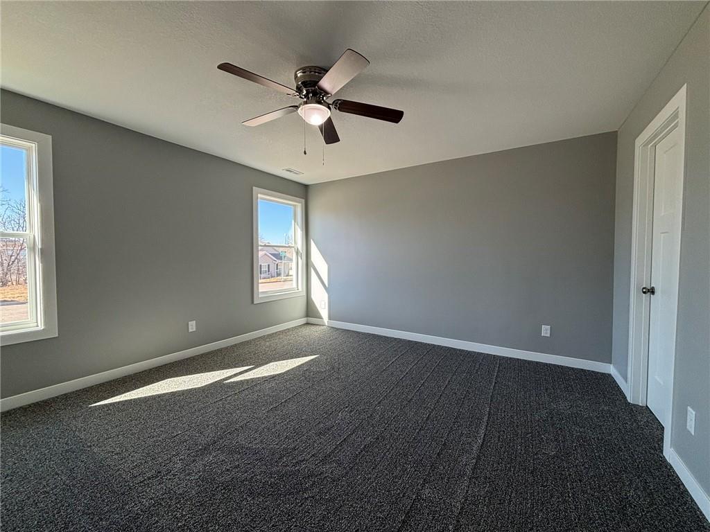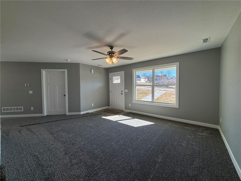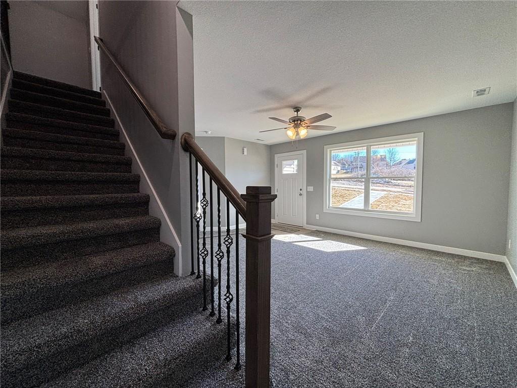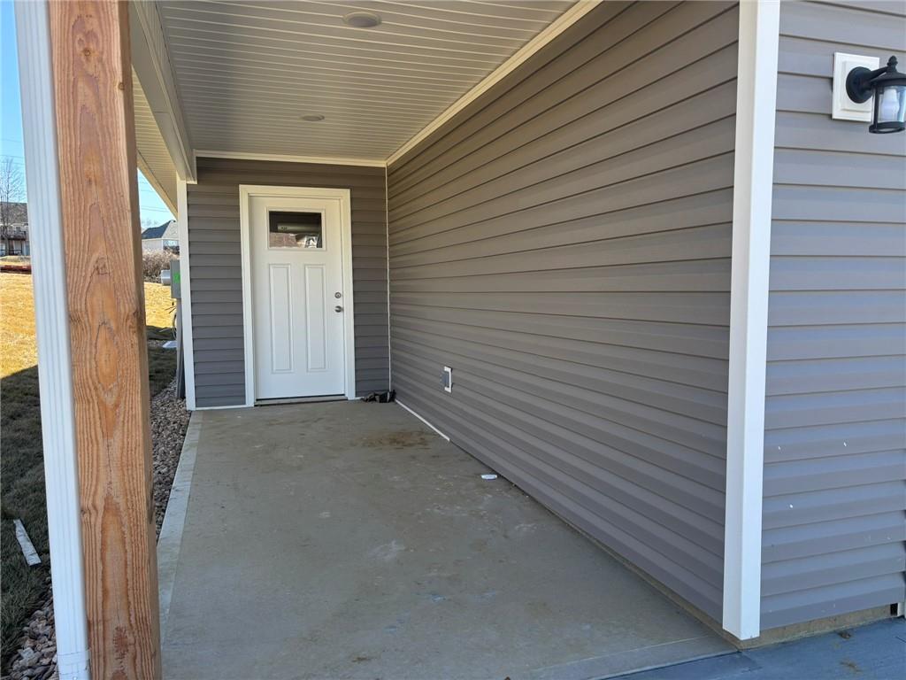 Conveniently located near I-29 just off Hwy 169 and FF Highway! This newly built, vinyl-sided home sits on a desirable corner lot and offers low-maintenance living with thoughtful design throughout. A covered front patio welcomes you into the well-laid-out 1.5-story floor plan featuring three bedrooms and two full baths. The spacious, open dining area flows seamlessly into the kitchen, showcasing quality-built cabinetry with dovetail construction and soft-close doors and drawers. Hard-surface countertops, stainless steel appliances, and an island with seating make this kitchen both functional and inviting. The primary suite is located on the main level and includes a walk-in closet and private ensuite bath with a dual-bowl vanity, 5-foot Onyx shower, and linen closet. Upstairs, you’ll find the third bedroom along with a comfortable family room—perfect for an additional TV space, guest area, or quiet retreat. Additional highlights include main-floor laundry, 2-car attached garage, and a covered back patio. Enjoy easy living with HOA services that include snow removal, mowing, and trash service—all for a low monthly fee.