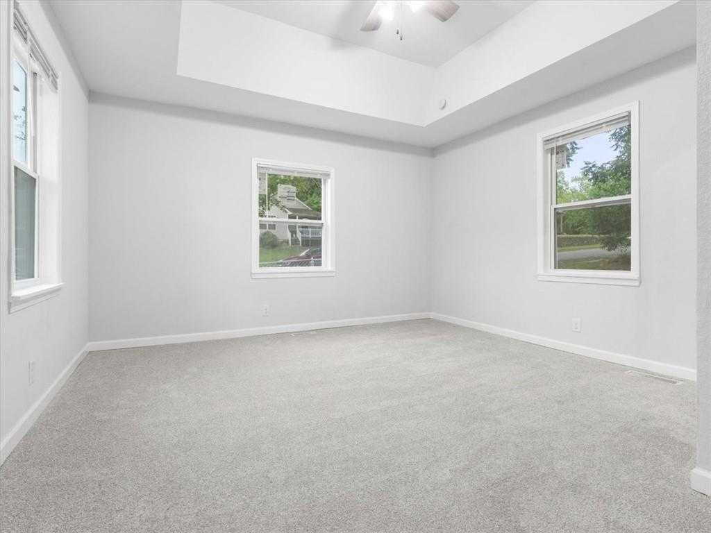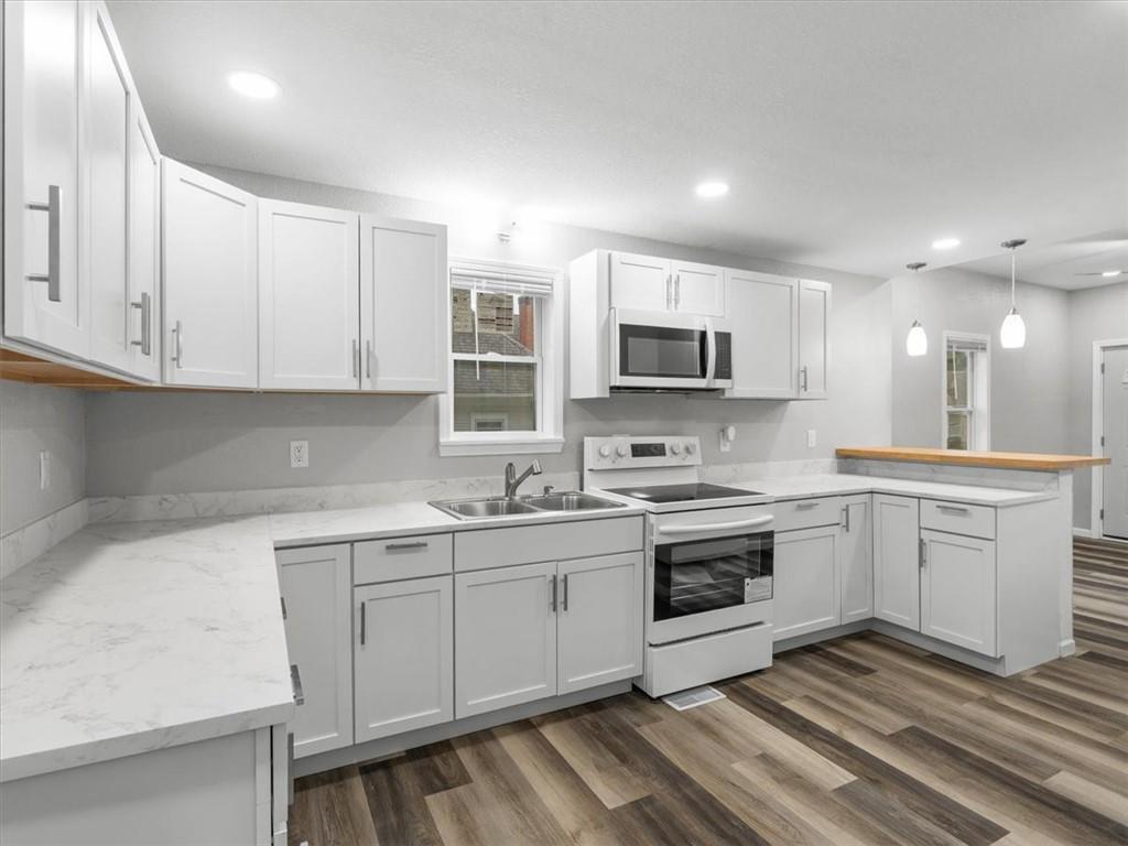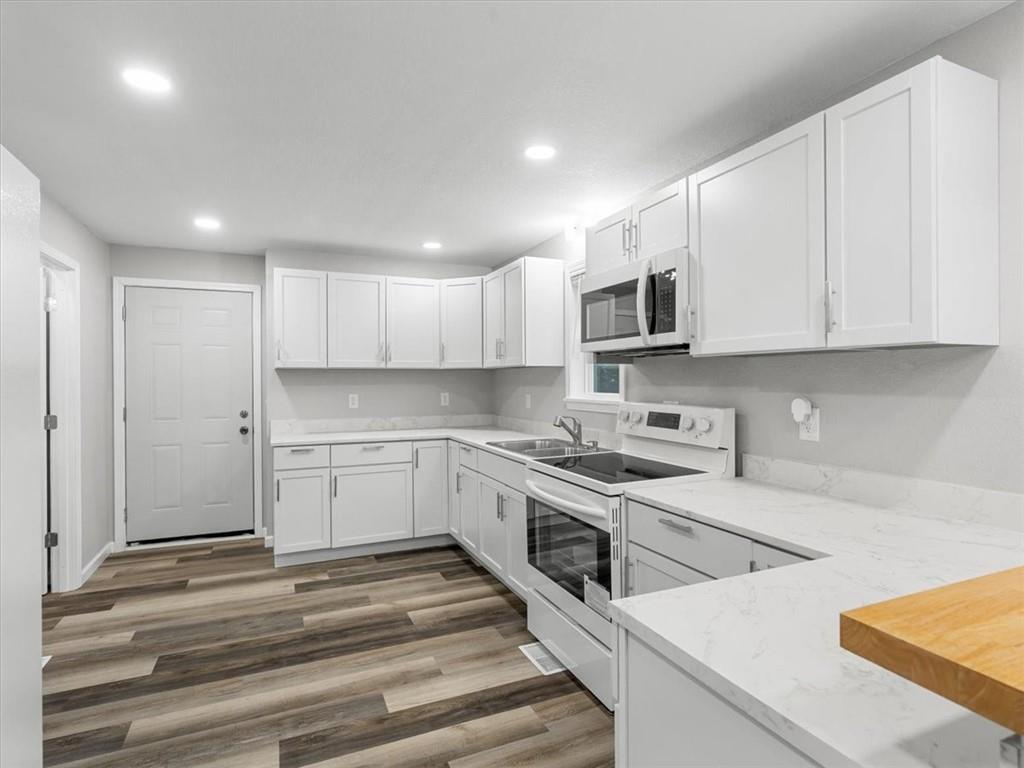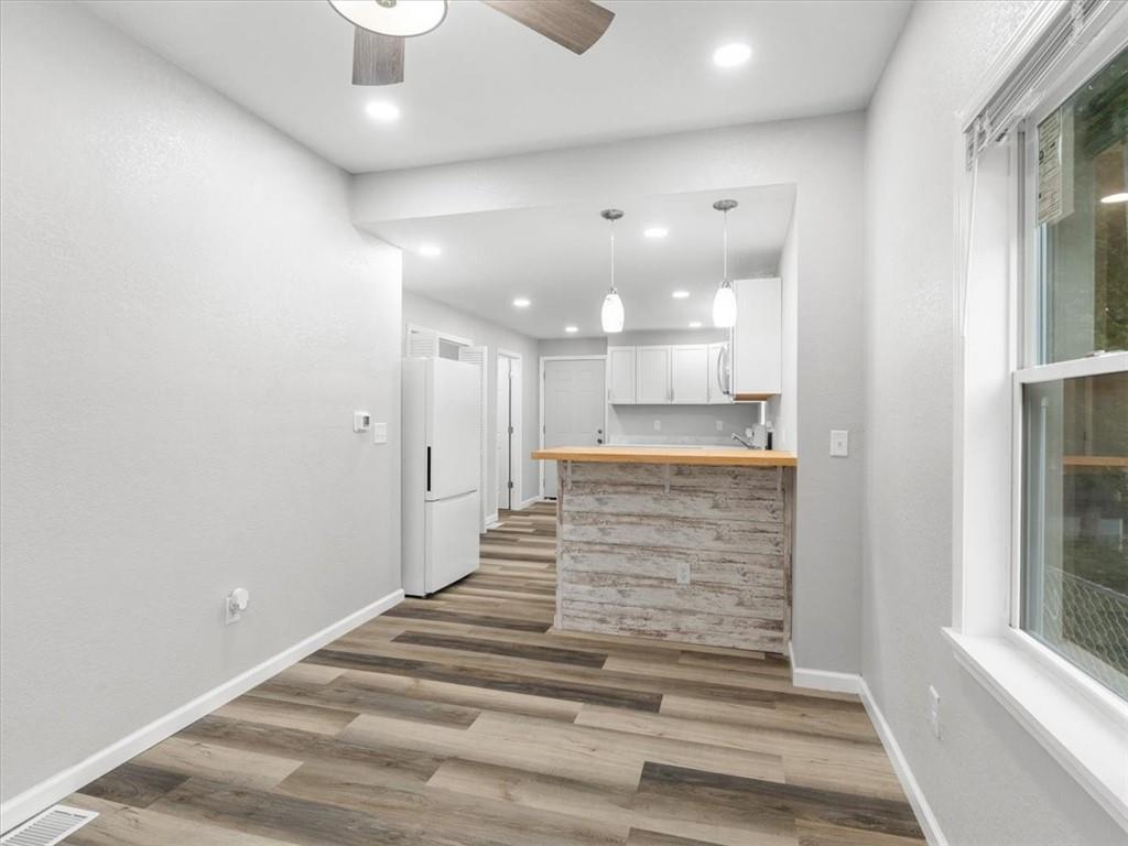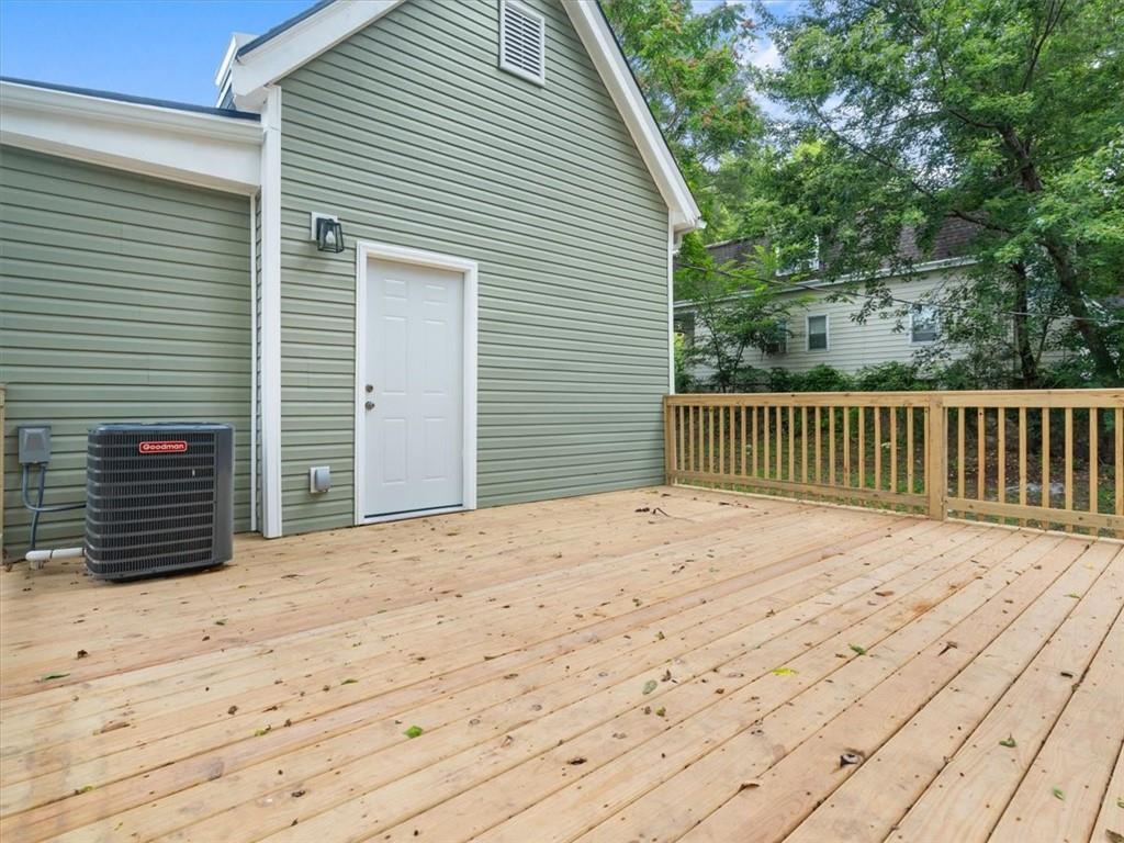 Step inside this beautifully updated 2 bedroom, 1 bath home with bonus space upstairs that works perfectly as a non-conforming bedroom or office. The open kitchen features bar seating and comes fully equipped with a stove, refrigerator, and microwave. Main floor laundry adds everyday convenience, while modern finishes throughout make the home truly move-in ready. Outside, enjoy both chain link and wood privacy fencing, a spacious deck for entertaining, and a patio area perfect for a firepit or outdoor seating.
